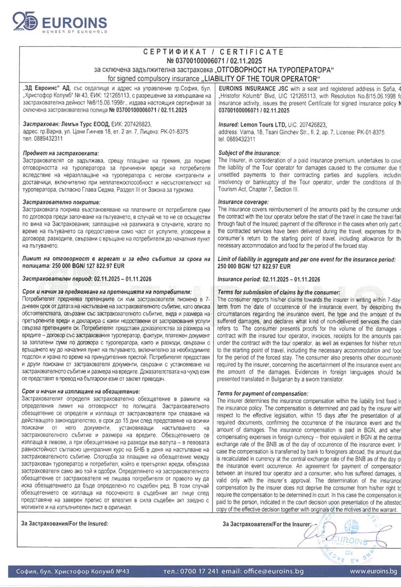 You acknowledge that adventures travel and the products and services offered by the Tour Operator may involve a significant amount of risk to your health and safety. By traveling on tour organized by Lemon Tours LTD you acknowledge that you have considered any potential risks to health and safety. You hereby assume responsibility for all such risk and releases the Lemon Tours LTD from all claims and causes of action arising from any losses, damages or injuries or death resulting from risks inherent in travel, including adventure travel specifically, visiting foreign destinations, and participating in adventurous activities such as those included in Tour itineraries or otherwise offered by Lemon Tours LTD / Private Guide Bulgaria.